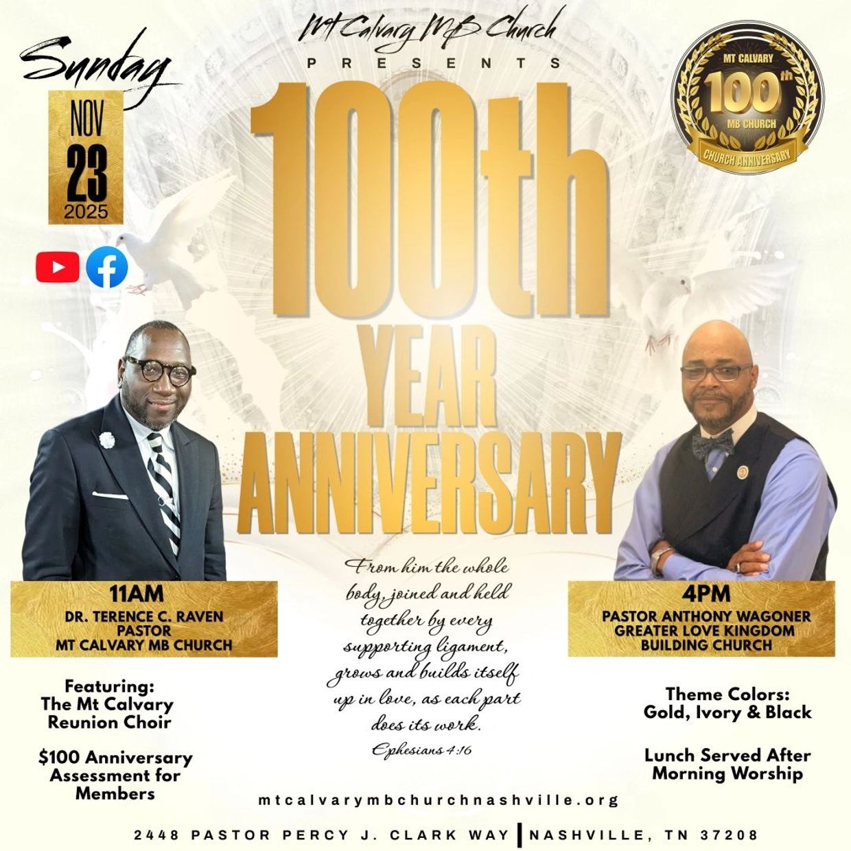 Please join us on Sunday, November 23rd, 2025 at 11am and 4pm as we celebrate this great milestone in our church history.